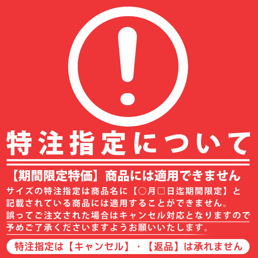 以下のサイズは「特注指定」となります。特注指定の商品は返品・交換を承ることができません。あらかじめご了承ください。また、商品名に【○月□日迄期間限定】と記載されている商品には、特注指定を適用できません。こちらもあわせてご了承ください。